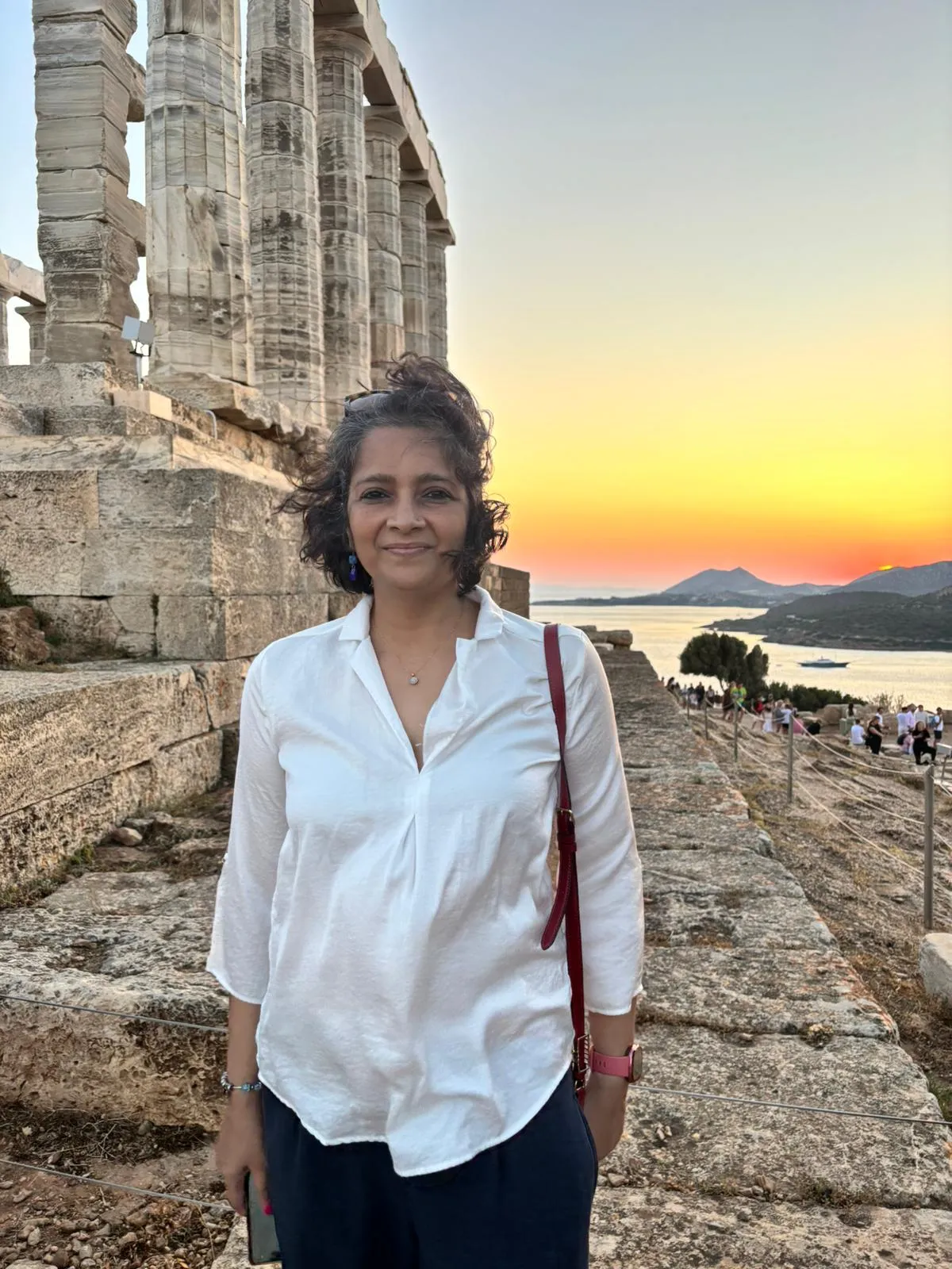 Enjoying the beautiful sun set behind the Temple of Poseidon overlooking the Aegean sea